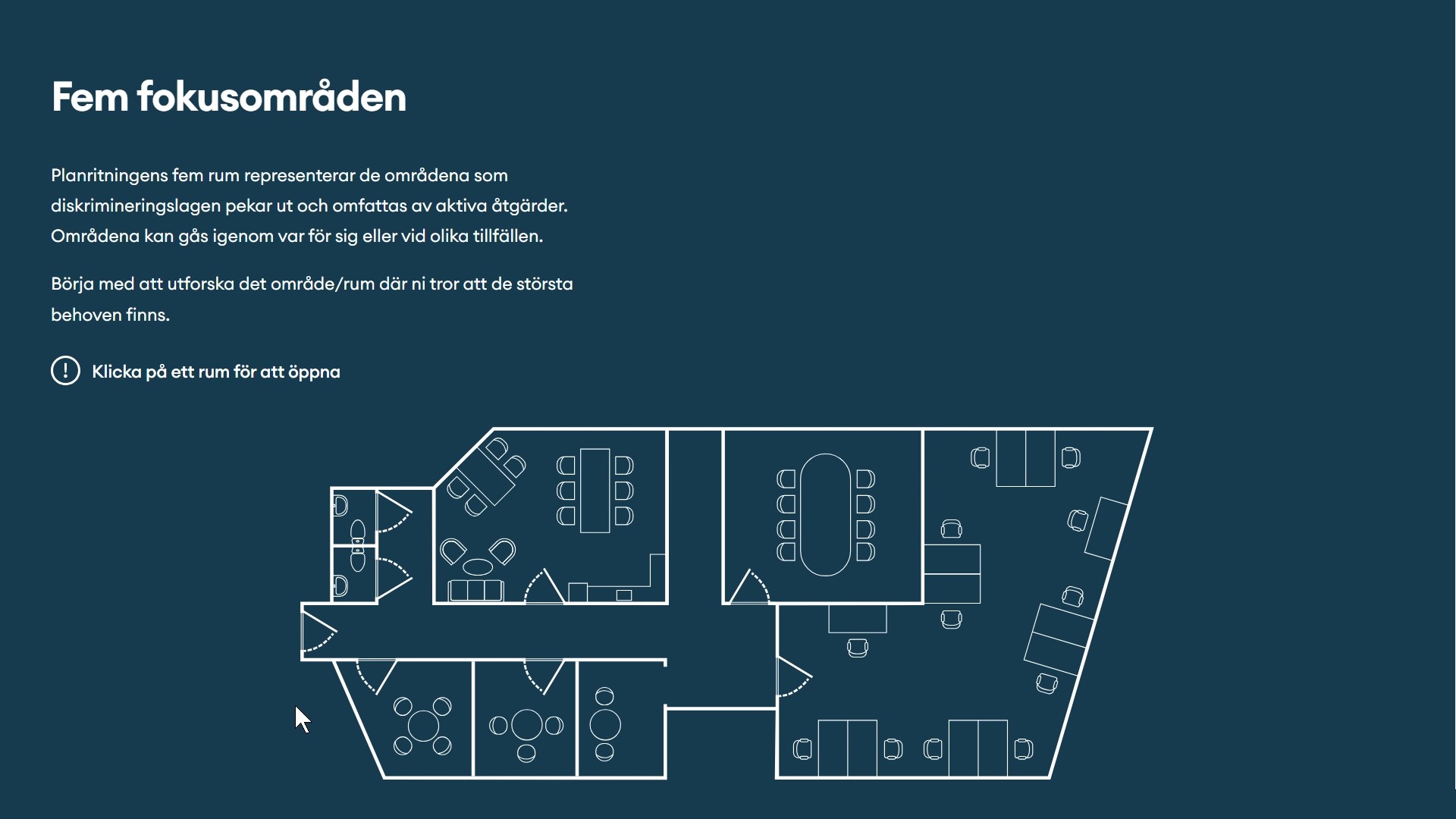 Stödmaterialet är strukturerat på ett innovativt sätt med fokus på både teoretiska och praktiska moment, där deltagarna guidas genom olika "rum", där varje rum representerar ett område inom arbetsmiljö och inkludering: